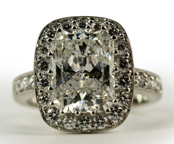 | RingDescription: Handmade ladies Platinum Diamond Halo Cluster Ring Metal: Platinum Gemstones: (Main) Radiant Diamond, 3.74ct, Colour D Gemstones: (Additional) Round Brilliant Diamond, 0.79ct, Colour G , Clarity VS2 Total Diamond Weight: 4.53ct Total Weight: 10.00 grams Certificate: EGL Price: Price On Request |