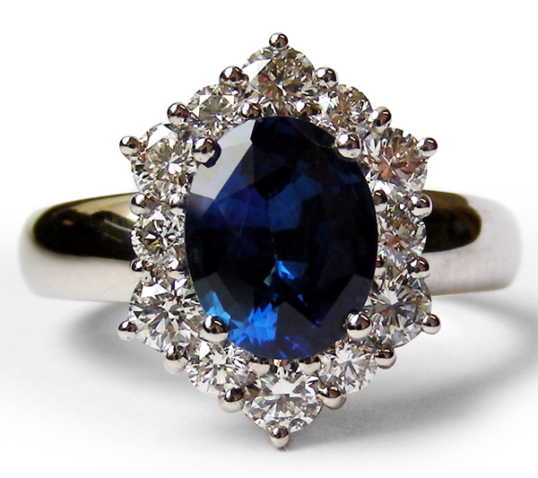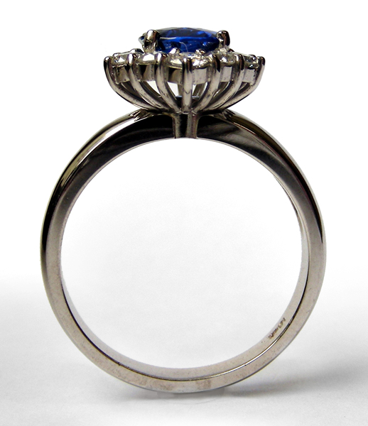 | RingDescription: Sapphire and Diamond Cluster Ring. Oval mixed cut sapphire 3.00ct and 12x round brilliant cut diamonds with total weight 1.08ct. Metal: 18ct White Gold Total Weight: 7.50 grams Price: NZ$17,500.00 |