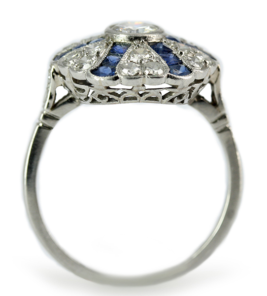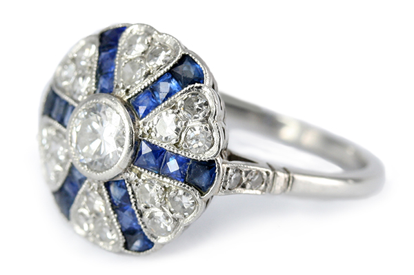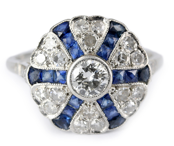 | RingDescription: Sapphire and Diamond (Art Deco Crusader) Cluster Metal: Platinum Gemstones: (Main) Brilliant and Single Diamond, 0.45ct, Colour F , Clarity VS1 Gemstones: (Additional) Single Cut Diamond, 0.62ct, Colour F-G , Clarity SI-I1 Total Diamond Weight: 1.07ct Total Weight: 5.06 grams Price: Price On Request |