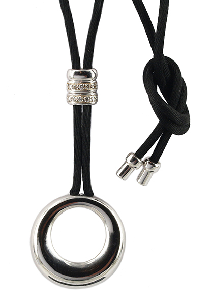 | Chaumet PendantDescription: Chaumet Annaud Paris Circle Necklace. 18ct white gold with diamond set bale and black cord necklet with display pouch.
