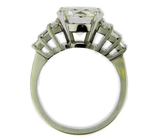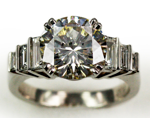 | RingDescription: Handmade Modern Diamond Cluster, 4 claw centre setting with baguette diamond set shoulders Metal: Platinum Gemstones: (Main) Round Brilliant Cut Diamond, 2.63ct, Colour L Total Weight: 7.00 grams Price: Price On Request |