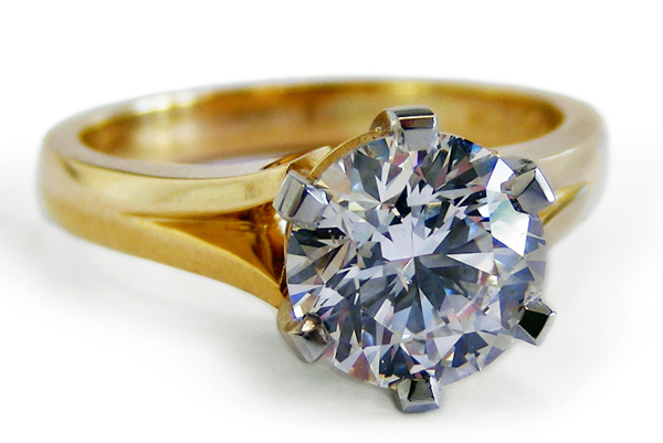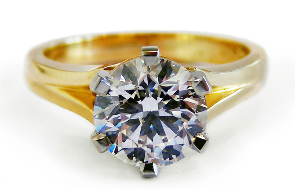 | RingDescription: Diamond Solitaire comprising of a central 6 claw setting, with a tulip support, and split pointed shoulders. Metal: 18ct Yellow Gold and Platinum Gemstones: (Main) Round Brilliant Cut Diamond, 1.50ct, Colour E Total Weight: 6.00 grams Certificate: EGL Price: Price On Request |