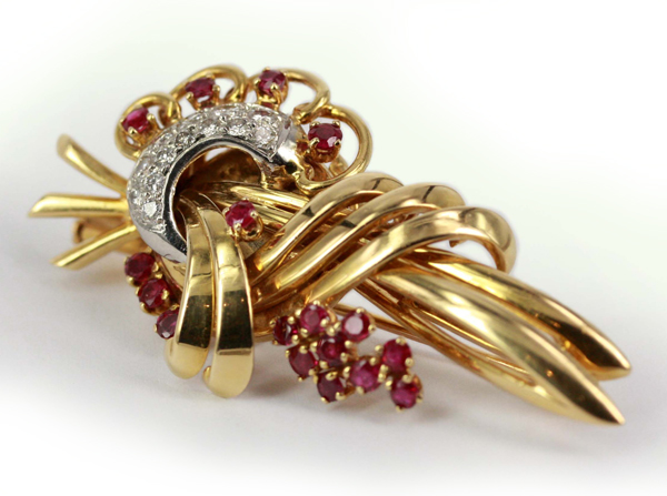 | Rolex BroochDescription: Vintage 18ct gold Ruby and Diamond Brooch with Watch Metal: 18ct Yellow Gold Price: Price On Request |