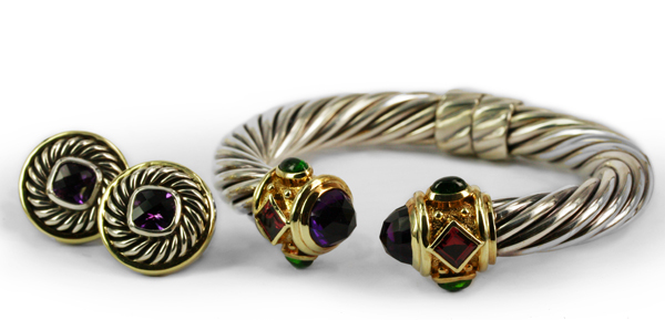 | DAVID YURMAN BraceletDescription: Renaissance cable collection , hinged bangle comprising of a twisted design with bezel and textured applied ends. Metal: Sterling Silver and 14ct Yellow Gold Gemstones: (Additional) Square faceted Garnet, 1.16ct, Colour Purple Red Total Diamond Weight: 1.16ct Total Weight: 52.05 grams Price: NZ$2,150.00 |