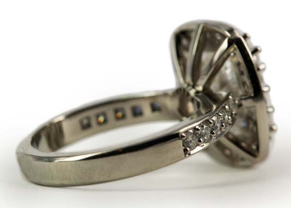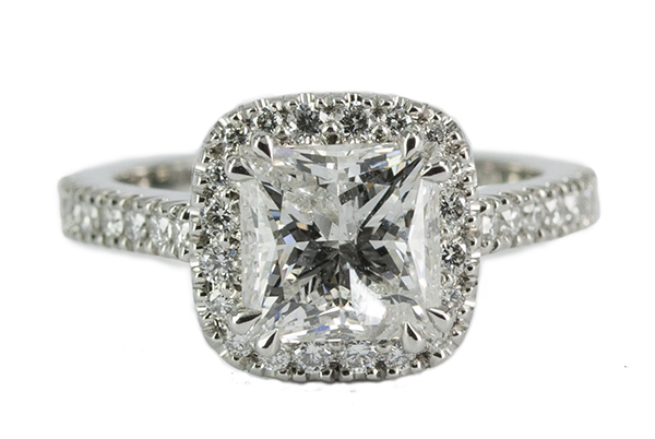 | Ring Description: Diamond Solitaire and diamond halo cluster Metal: Platinum Gemstones: (Main) Princess Diamond, 2.02ct, Colour F , Clarity I2+ Gemstones: (Additional) round brilliant cut Diamond, 0.38ct, Colour D-H , Clarity SI Total Diamond Weight: 2.40ct Total Weight: 6.50 grams Price: Price On Request