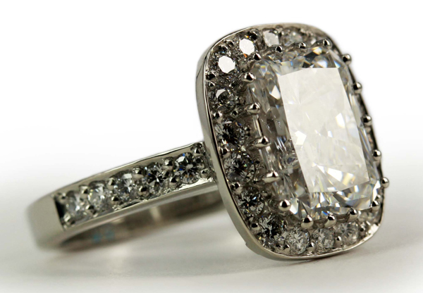 | RingDescription: Handmade ladies Platinum Diamond Halo Cluster Ring Metal: Platinum Gemstones: (Main) Radiant Diamond, 3.74ct, Colour D Gemstones: (Additional) Round Brilliant Diamond, 0.79ct, Colour G , Clarity VS2 Total Diamond Weight: 4.53ct Total Weight: 10.00 grams Certificate: EGL Price: Price On Request |