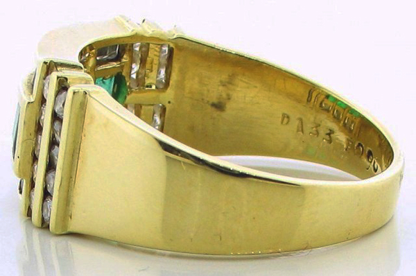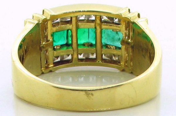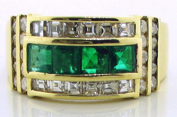 | RingDescription: Emerald and Diamond Dress Ring, comprising of central and surrounding channel settings, with open back support, bar set shoulders and plain shank Metal: 18ct Yellow Gold Gemstones: (Main) 4, Square Step Cut Emerald, 0.76ct Gemstones: (Additional) 32 x Square & Round Diamond, 0.97ct, Colour G-H , Clarity VS2 Total Diamond Weight: 1.73ct Total Weight: 8.94 grams Certificate: 17061 Price: NZ$2,900.00 |