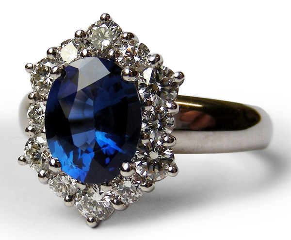 | RingDescription: Sapphire and Diamond Cluster Ring. Oval mixed cut sapphire 3.00ct and 12x round brilliant cut diamonds with total weight 1.08ct. Metal: 18ct White Gold Total Weight: 7.50 grams Price: NZ$17,500.00 |