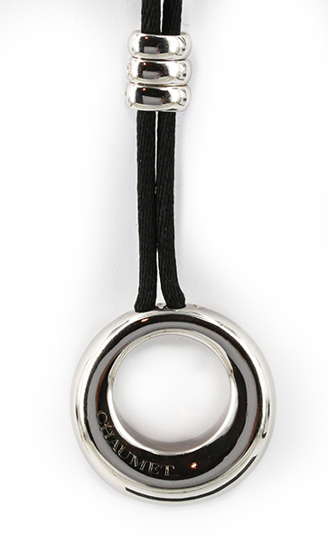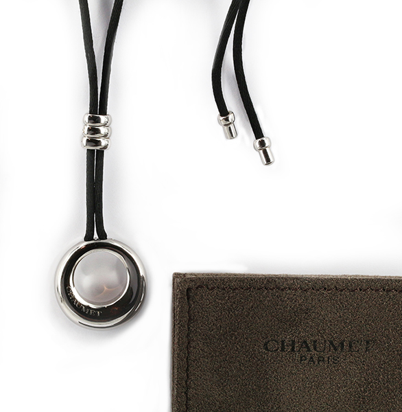| Chaumet PendantDescription: Chaumet Annaud Paris Circle Necklace. 18ct white gold with diamond set bale and black cord necklet with display pouch.