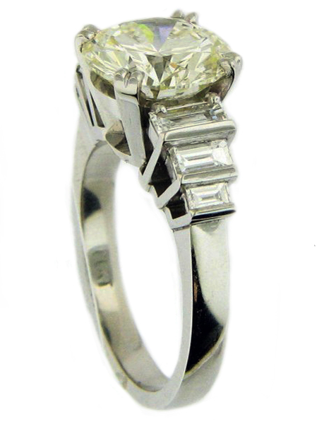 | RingDescription: Handmade Modern Diamond Cluster, 4 claw centre setting with baguette diamond set shoulders Metal: Platinum Gemstones: (Main) Round Brilliant Cut Diamond, 2.63ct, Colour L Total Weight: 7.00 grams Price: Price On Request |