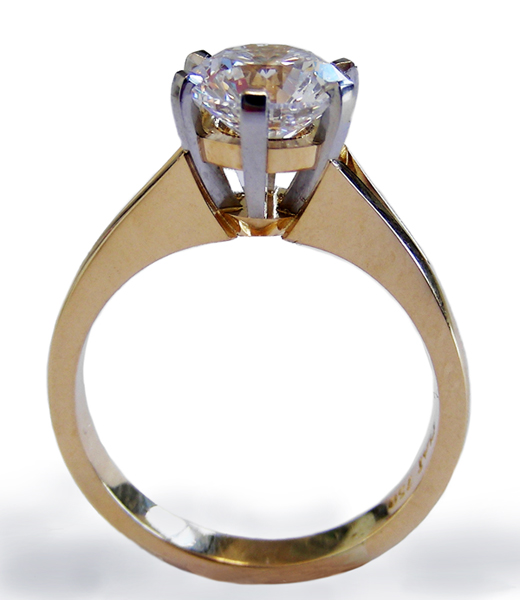 | RingDescription: Diamond Solitaire comprising of a central 6 claw setting, with a tulip support, and split pointed shoulders. Metal: 18ct Yellow Gold and Platinum Gemstones: (Main) Round Brilliant Cut Diamond, 1.50ct, Colour E Total Weight: 6.00 grams Certificate: EGL Price: Price On Request |