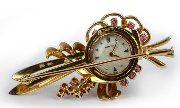 | Rolex BroochDescription: Vintage 18ct gold Ruby and Diamond Brooch with Watch Metal: 18ct Yellow Gold Price: Price On Request |