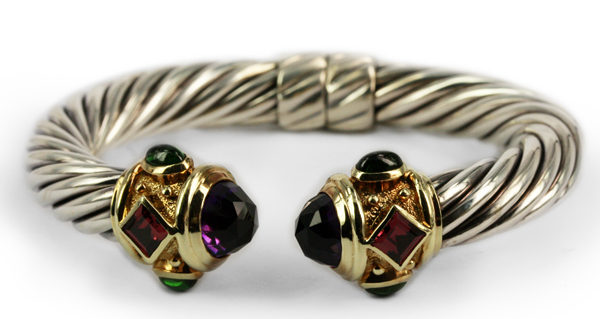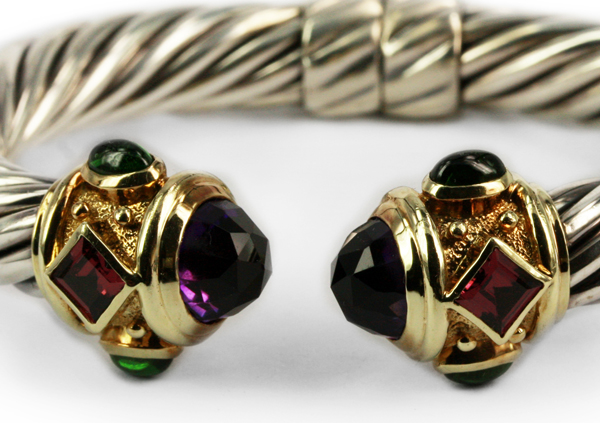 | DAVID YURMAN BraceletDescription: Renaissance cable collection , hinged bangle comprising of a twisted design with bezel and textured applied ends. Metal: Sterling Silver and 14ct Yellow Gold Gemstones: (Additional) Square faceted Garnet, 1.16ct, Colour Purple Red Total Diamond Weight: 1.16ct Total Weight: 52.05 grams Price: NZ$2,150.00 |